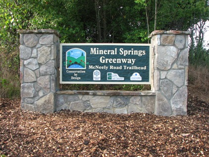As part of the "Conservation by Design" theme of Mineral Springs, our greenway is a singular accomplishment, one that I brought with me as just a dream at the very founding of the town in 1999, and that your town council has turned into a reality over the course of the past ten years. The Mineral Springs Greenway has its main trailhead on McNeely Road, and the trails that make up the greenway follow the Wolf and Bates Branches behind the Harrington Hall and Copper Run subdivisions. The first "piece of the puzzle" was approximately 7.5 acres of floodplain that was donated to the town by the original developers of the Harrington Hall subdivision in 2005. |